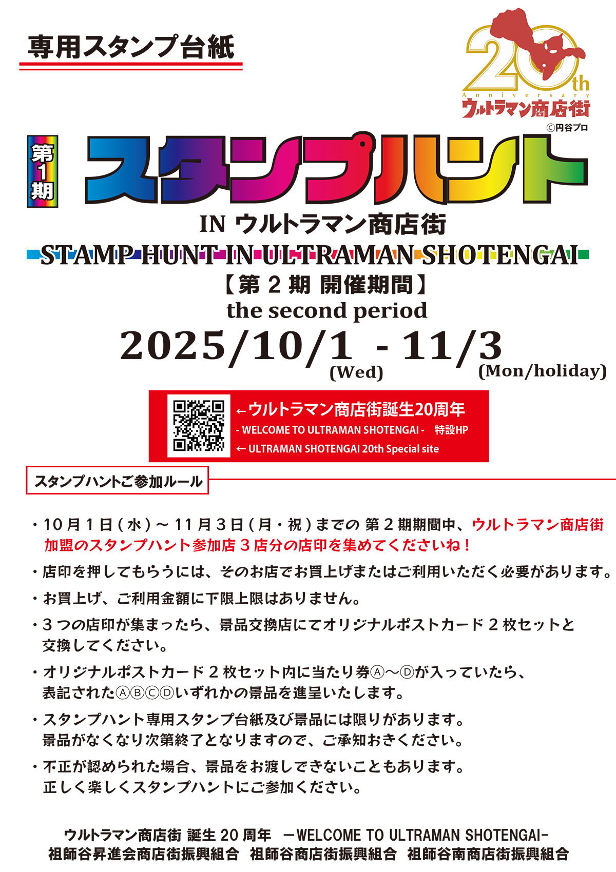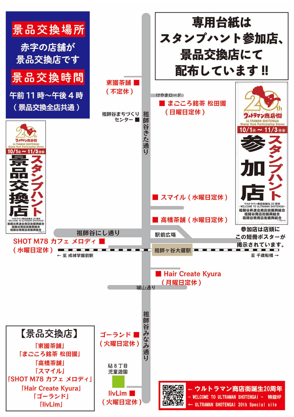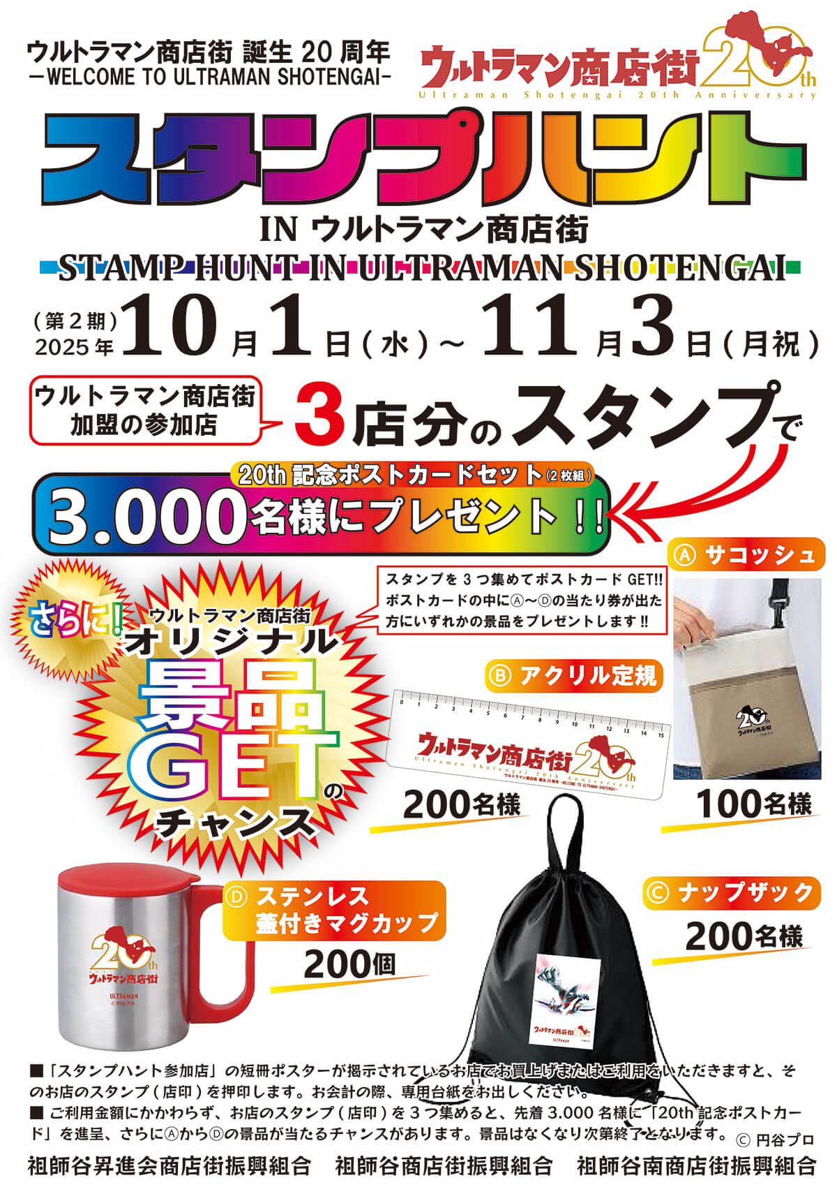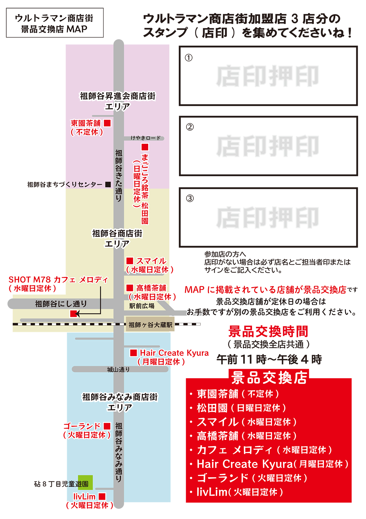 祖師谷昇進会商店街、祖師谷商店街、祖師谷みなみ商店街の3つの商店街に加盟している商店街ごと1店づつ、お買い物またはご利用してスタンプ(店印)を3店舗分集めると、ウルトラマン商店街オリジナルポストカード(2枚セット)を進呈!(各期先着3,000セット・ポストカードは1期と2期で絵柄が違います)